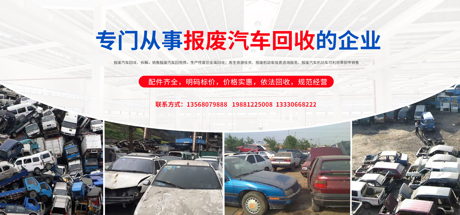 我公司在報廢汽車回收拆解中,認真貫徹執(zhí)行國家法律法規(guī),嚴格執(zhí)行國務(wù)院令第307號,積極開展行業(yè)自律,依法回收,規(guī)范經(jīng)營,從源頭上控制了報廢汽車整車、拼裝車、“五大總成”等上路和重新流入市場的現(xiàn)象,為緩解我市資源短缺,減輕環(huán)境污染,促進資源循環(huán),維護人民群眾生命財產(chǎn)安全和道路交通安全起到了巨大的作用。